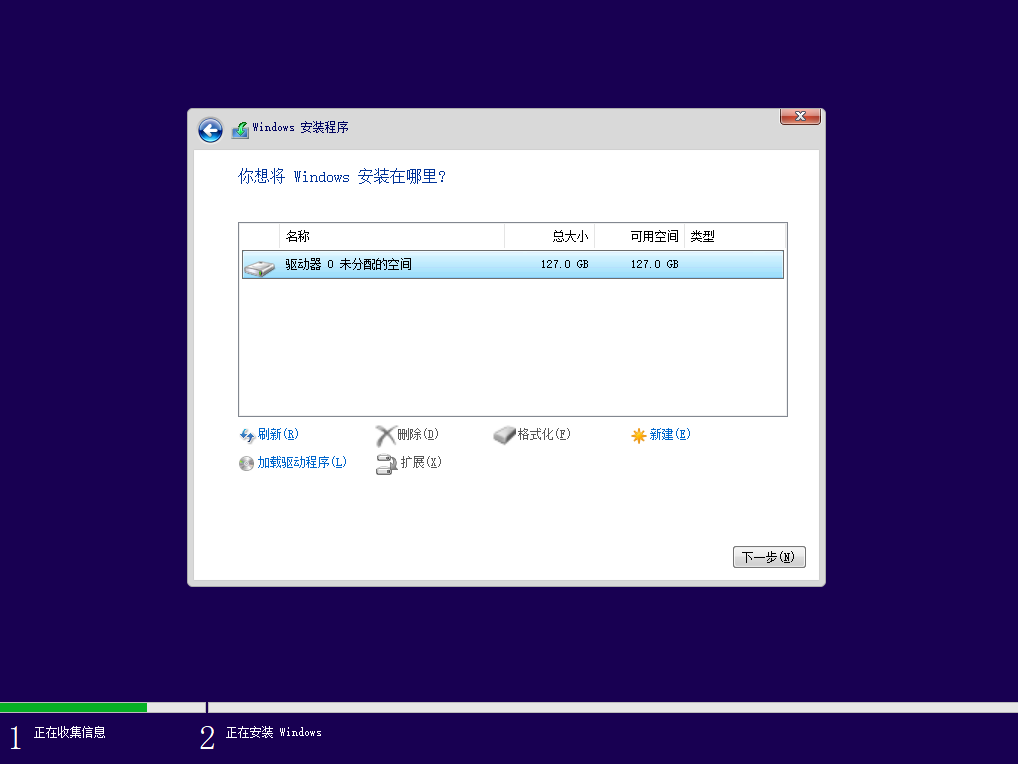 如果你是全新的电脑,这里只会出现未分配的空间,重装的就会出现你的硬盘分区和默认隐藏的分区。
